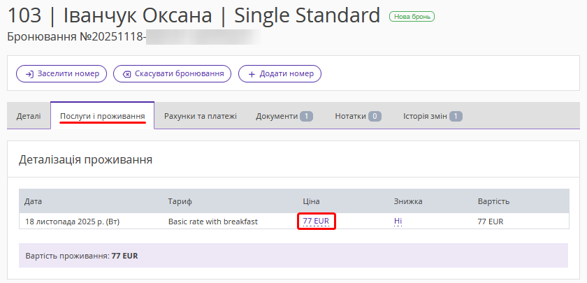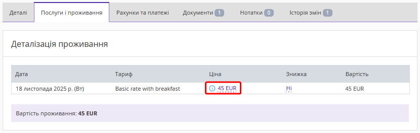 У карті бронювання перейдіть на вкладку «Послуги і проживання». У блоці «Деталізація проживання» натисніть на ціну.