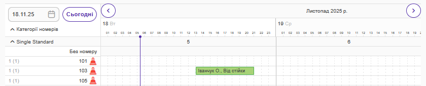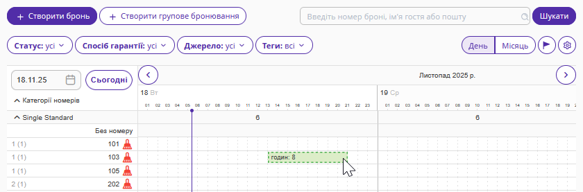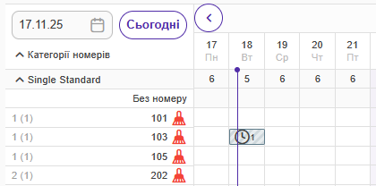 У шахівниці на рівні номера для заселення виберіть клітинку, яка відповідає часу заїзду, і лівою кнопкою миші виділіть потрібну кількість годин. У прикладі на скріншоті гість заїжджає в номер 103 о 13 годині, а виїжджає о 21 годині.