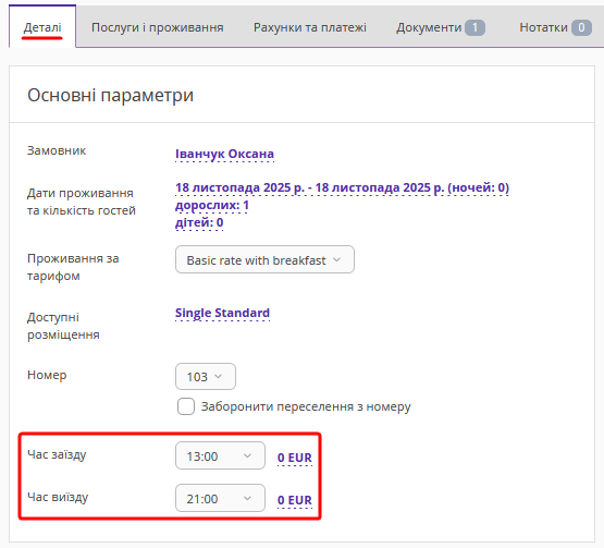 Для редагування часу заїзду або виїзду перейдіть до картки бронювання → вкладка «Деталі» → блок «Основні параметри» → змініть час у пункті «Час заїзду» або «Час виїзду». Детальніше читайте в статті «Як змінити час заїзду та виїзду у бронюванні в Exely PMS».