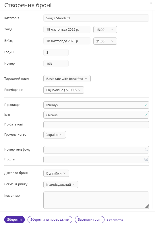 Відкриється віконце "Бронювання номера". Заповніть всі поля та збережіть бронювання.