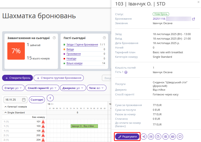Зверніть увагу, що за замовчуванням у бронюванні буде встановлена ціна за весь день незалежно від кількості вибраних годин. Щоб змінити ціну, перейдіть до редагування бронювання — натисніть бронювання та на панелі що з’явилась натисніть на кнопку «Редагувати».