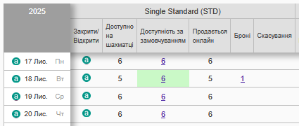 Ви маєте змогу це побачити в розділі «Керування номерами» → «Доступність номерів» → вкладка «Календар» → стовпець «Доступно на шахматці». У стовпці «Доступність за замовчуванням» значення не змінюється, але підсвічується зеленим, як при ручному перевизначенні.