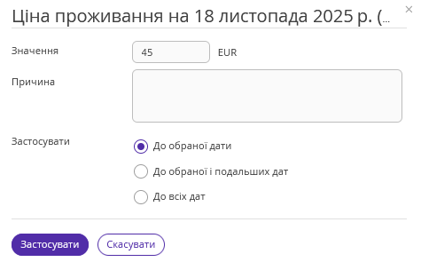 У віконці «Ціна проживання» встановіть нове значення. Натисніть «Застосувати».