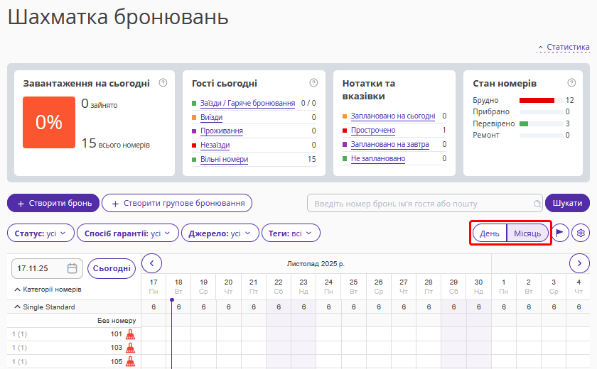 Над шахівницею з'явиться перемикач «День | Місяць». При натисканні на кнопку «День» шахівниця перемикається у режим погодинного бронювання — на годинній шкалі годинник замінить дні, а кожна клітина буде відповідати одній годині.